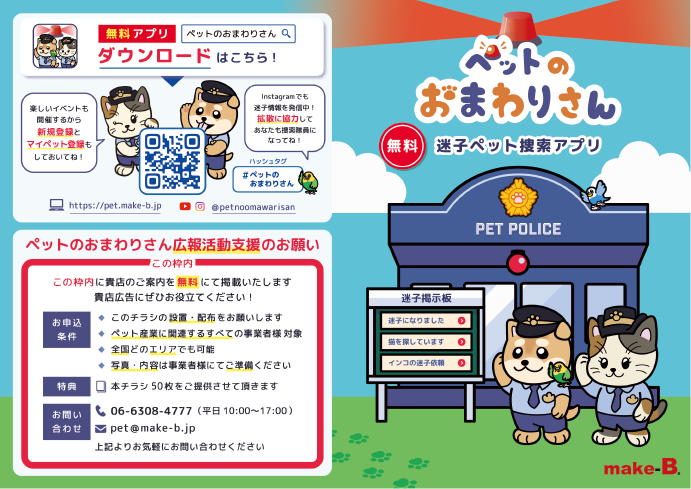 | 問い合わせ先 | TEL : 06-6308-4777 MAIL : pet@make-b.jp http://pet.make-b.jp/ |