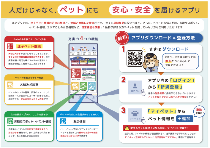本アプリは、主として、利用登録された方(以下「利用者」という。)のペットが迷子になった際に、他の利用者と迷子情報を共有することで、迷子になったペットの捜索に関する情報を収集し、収集することができたペットの捜索に関する情報等を利用者に提供することを目的としています。また、その他ペットに関する有益な情報を利用者に提供することを目的としています。なお、本アプリは、あくまで上記の情報提供を目的とするものであり、迷子になったペットの捜索の実現を保証するものではありません。