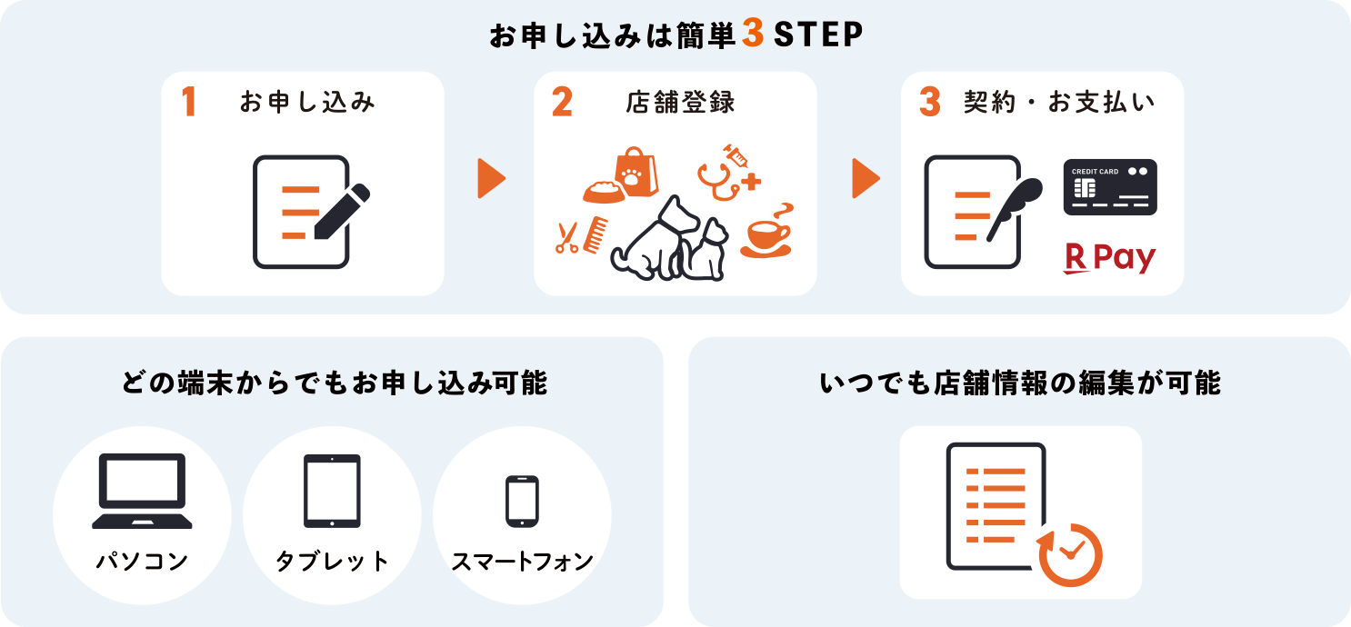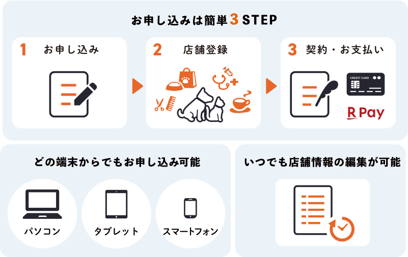 PC・タブレット・スマートフォン、どの端末からでも簡単にお申し込み・店舗情報の編集ができます。